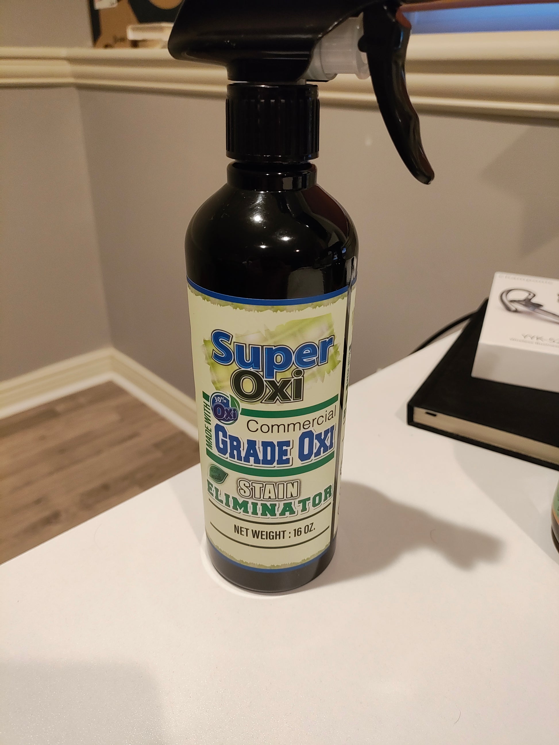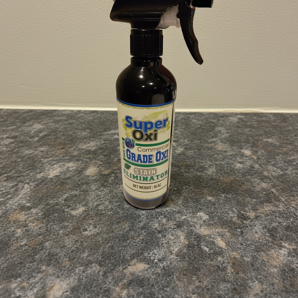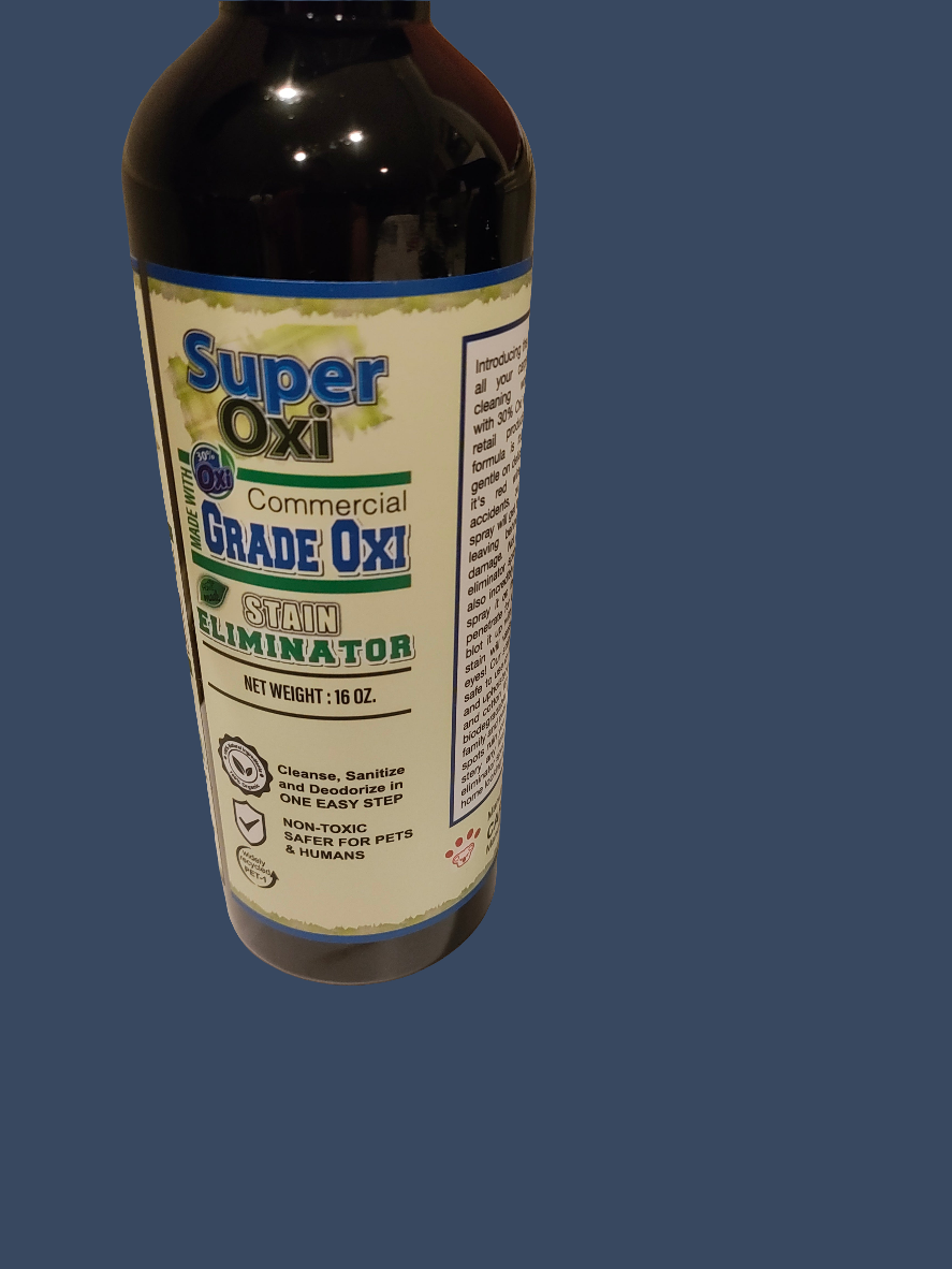 Introducing the ultimate solution to all your carpet and upholstery cleaning woes--SuperOxi--made with 30% Oxi vs. 18% in other Oxi retail products. This powerful formula is tough on stains, yet gentle on delicate fabrics. Whether its red wine, coffee, or pet accidents, our stain eliminator spray will get the job done without leaving behind any residue or damage. Not only is our stain eliminator spray effective, but its also incredibly easy to use. Simply spray it on the stain, allow it allow it to penetrate for a few minutes, then blot it up with a clean cloth. The stain will vanish before your very eyes! Our stain eliminator spray is safe to use on all types of carpets and upholstery, including wool, silk, and cotton, It's also non-toxic and biodegradable, so it's safe for your family and pets. Don't let stains and spots ruin your carpets and upholstery any longer. Order our stain eliminator spray today and get your home looking it's best!